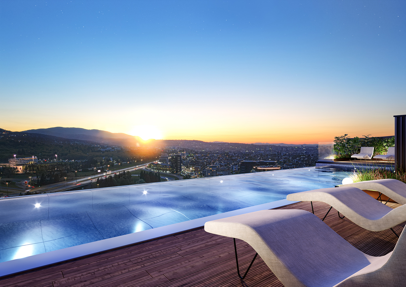 Facades of Sky Towers by AMur feature a combination of ventilated composite panel cladding, glass system with aluminum profiles, and large-format granite tiles. The interplay of solid and transparent surfaces adds depth and creates a dynamic visual rhythm. Vertical elements highlight the height of the buildings, while horizontal elements provide a sense of lightness and balance within the environment. Curved and organic forms reference the silhouette of Vitosha, softening the strict urban lines and adding elegance to the overall design.