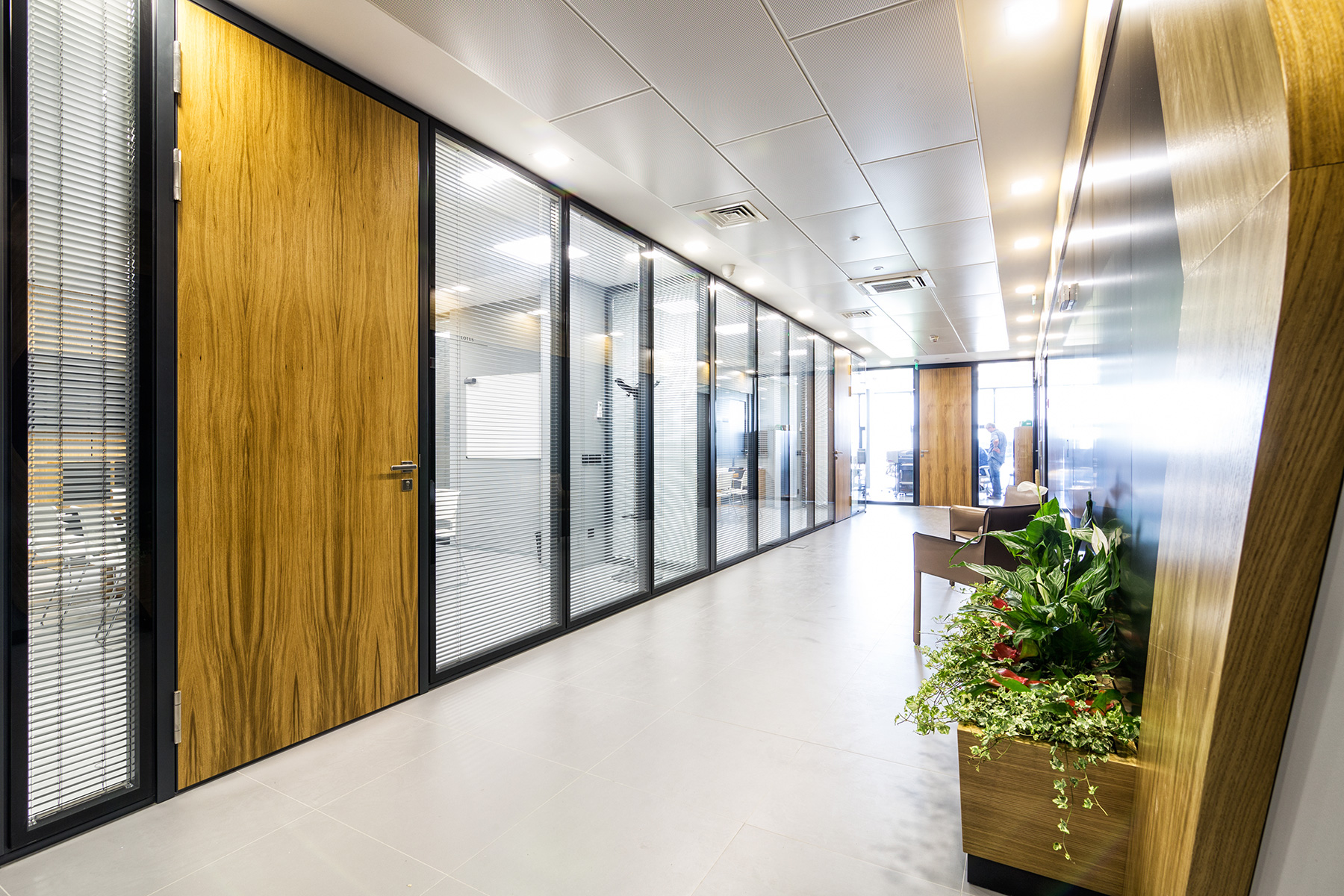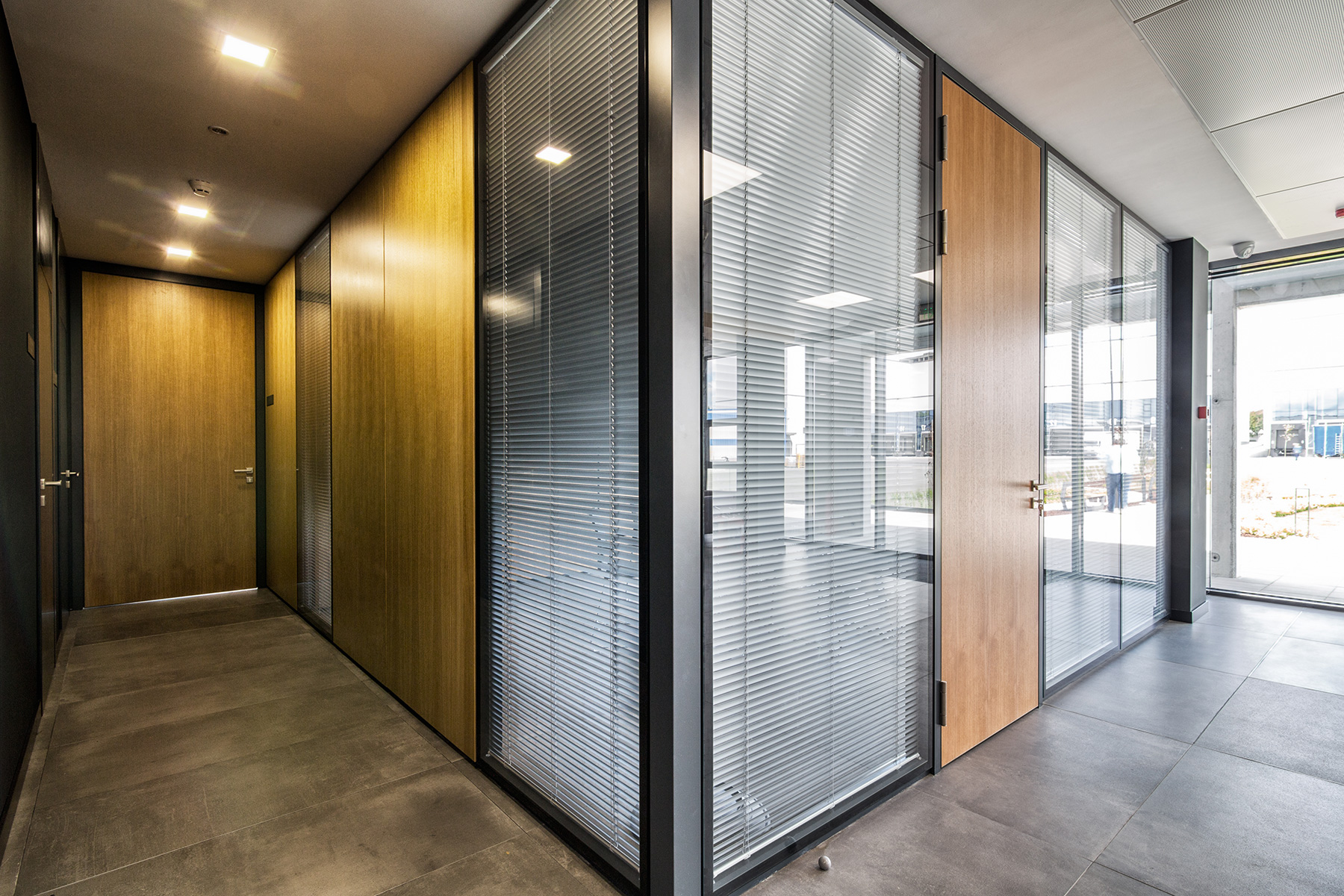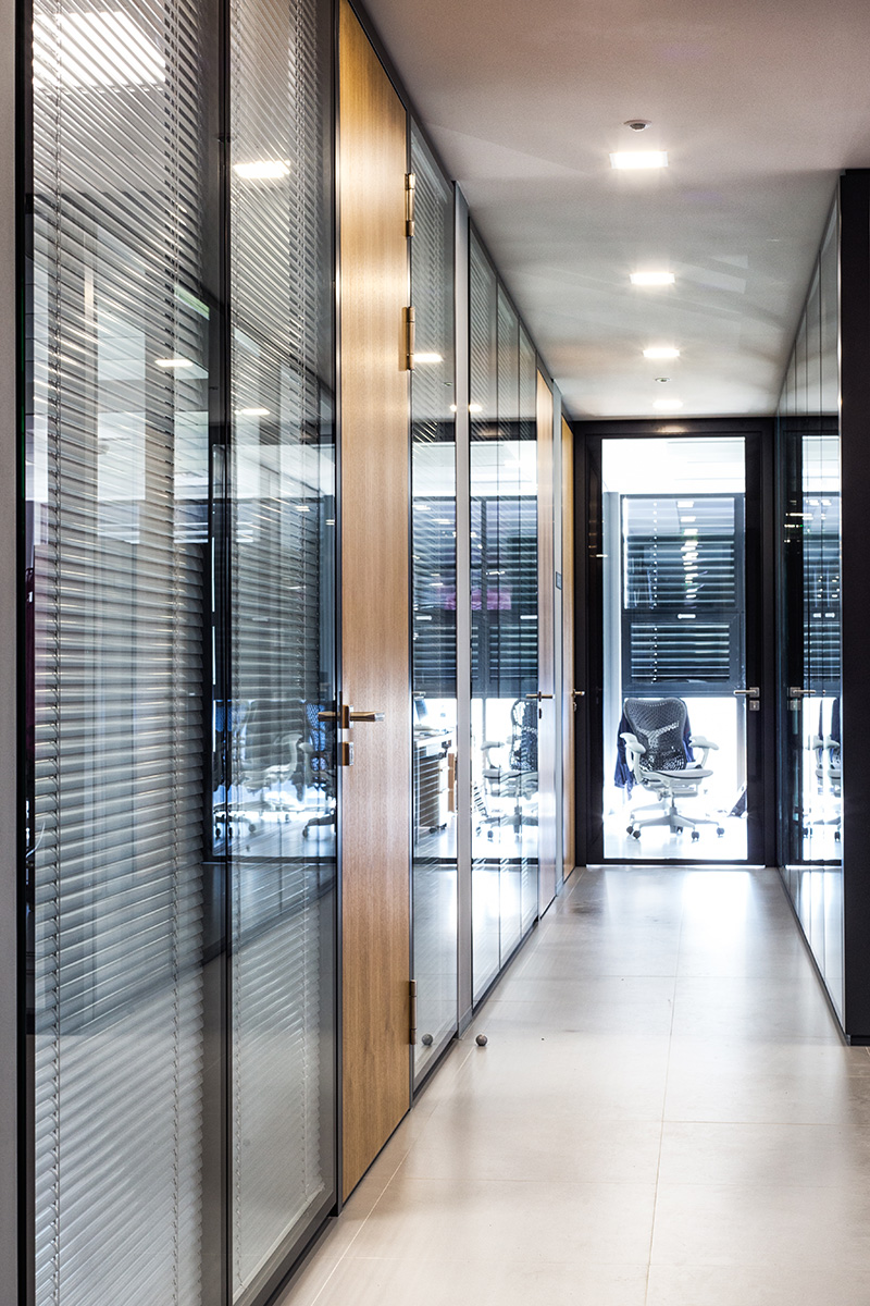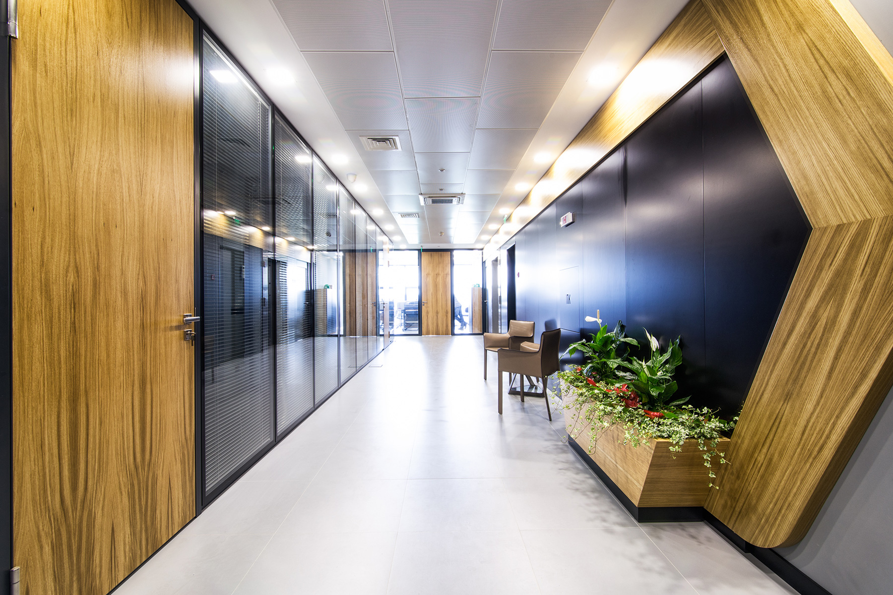 Тръгвайки по коридорите на сградата, дървото се появява като акцент и в облицовките на стените, както и при дизайна на вратите в коридора и панелите в конферентната зала. То е избрано като топъл контрастен елемент на иначе студените повърхности, които ви посрещат в цялата сграда - каменни плочи, тъмни стенни покрития и стъклени преградни стени.