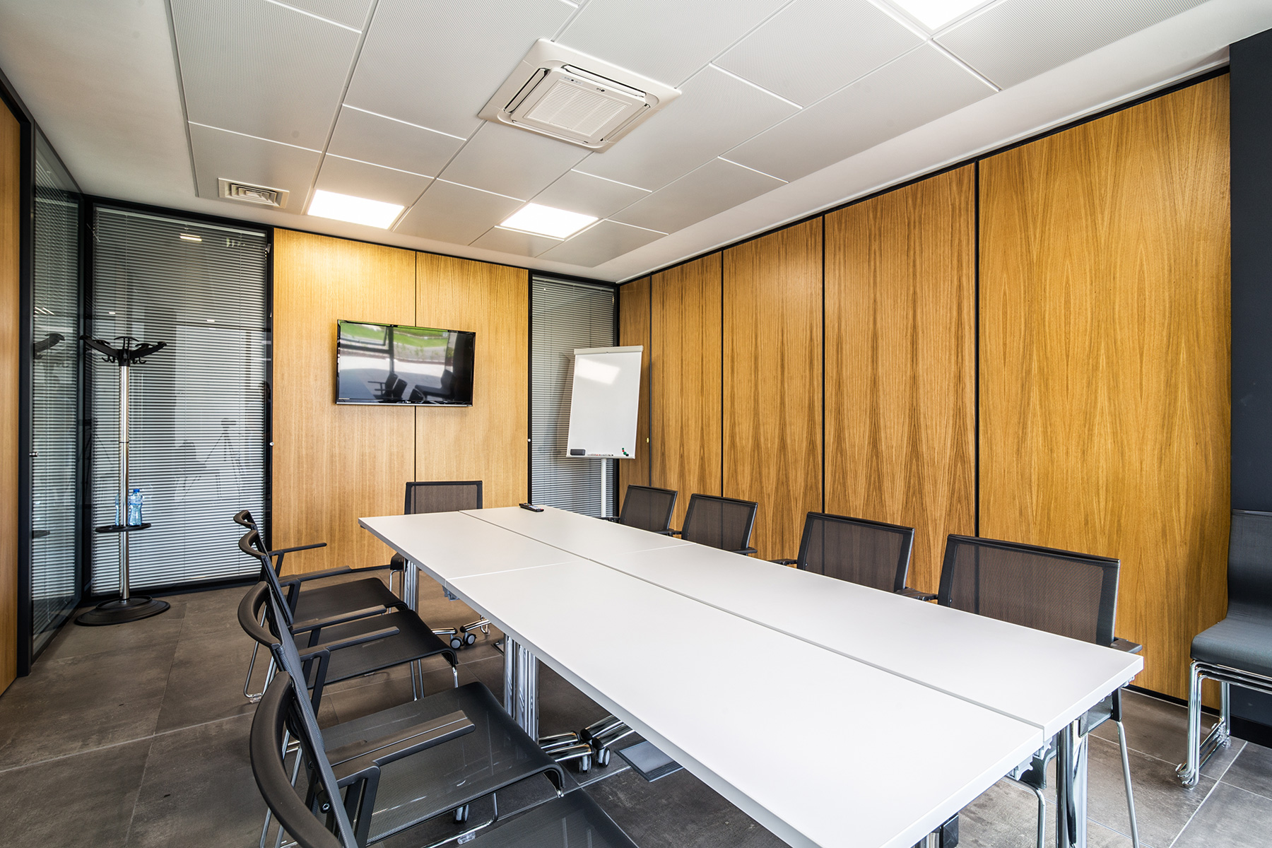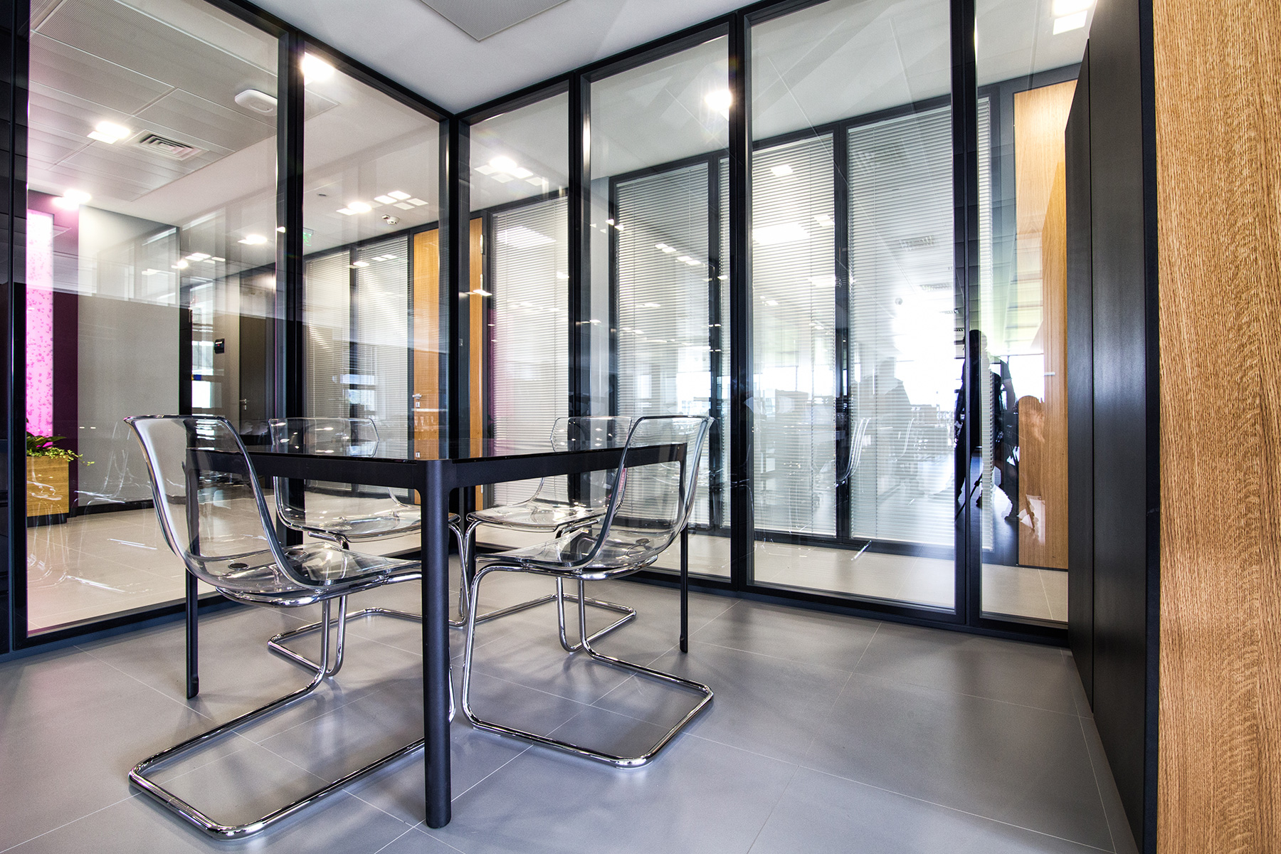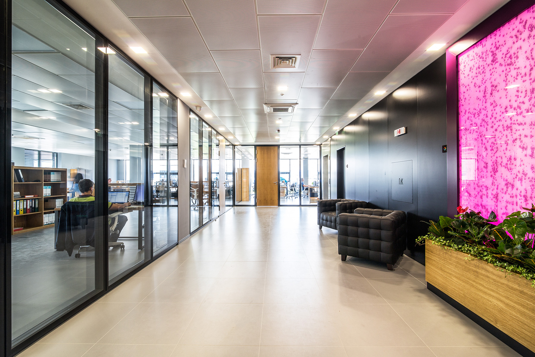 Тръгвайки по коридорите на сградата, дървото се появява като акцент и в облицовките на стените, както и при дизайна на вратите в коридора и панелите в конферентната зала. То е избрано като топъл контрастен елемент на иначе студените повърхности, които ви посрещат в цялата сграда - каменни плочи, тъмни стенни покрития и стъклени преградни стени.
